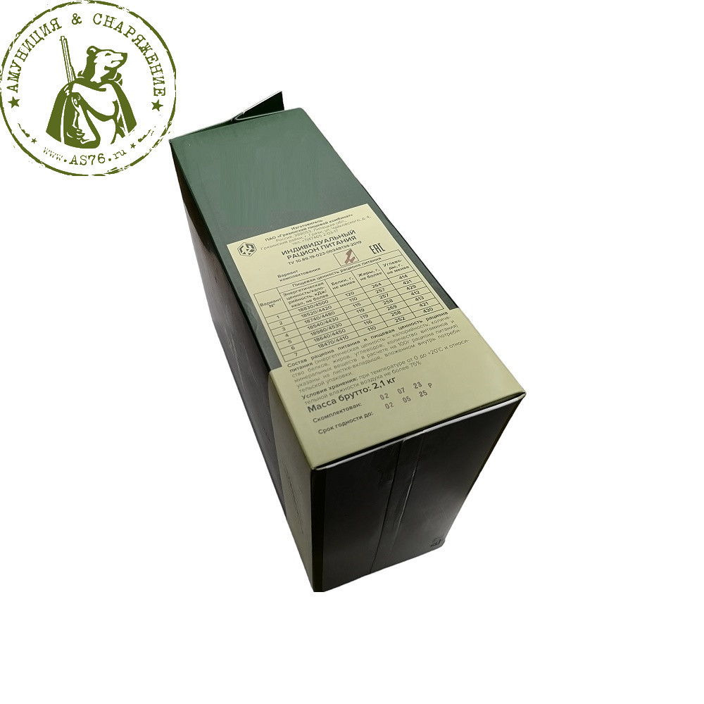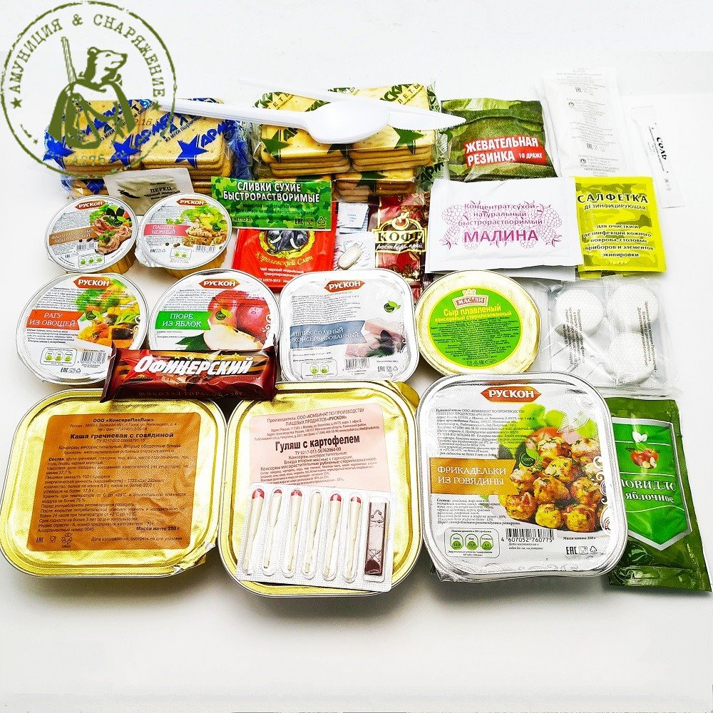 В комплект индивидуального рациона, входит необходимый запас еды и сопутствующих материалов на 1 сутки, для людей с тяжелой физической, эмоциональной и умственной нагрузкой. Комплект может быть использован для двух человек, или одного человека на два дня. Внутри сухого пайка, применительно к его содержанию, есть рекомендации по завтраку, обеду, ужину.