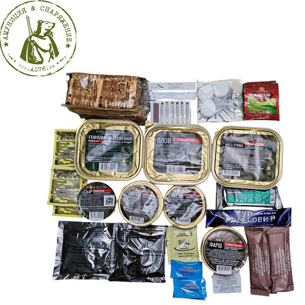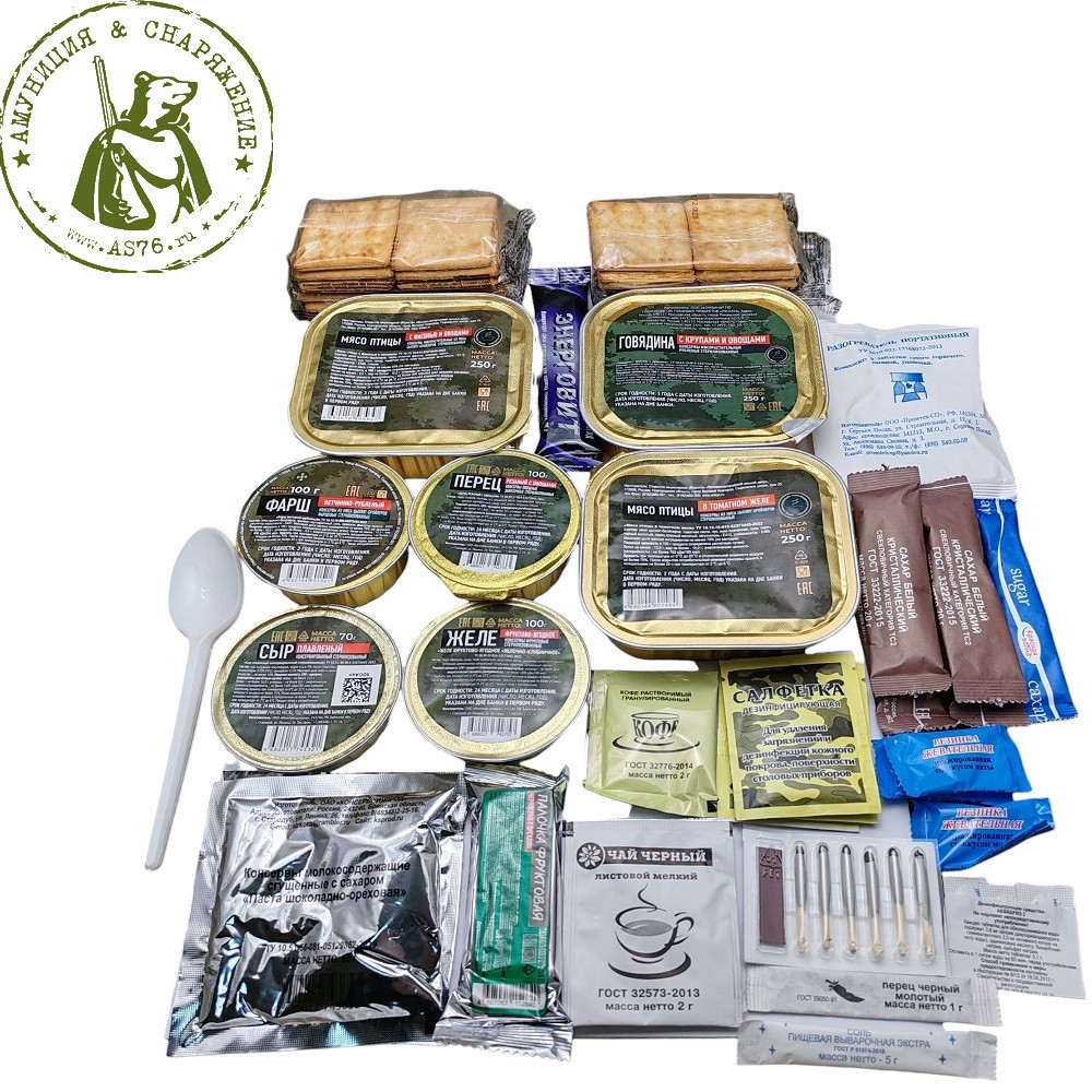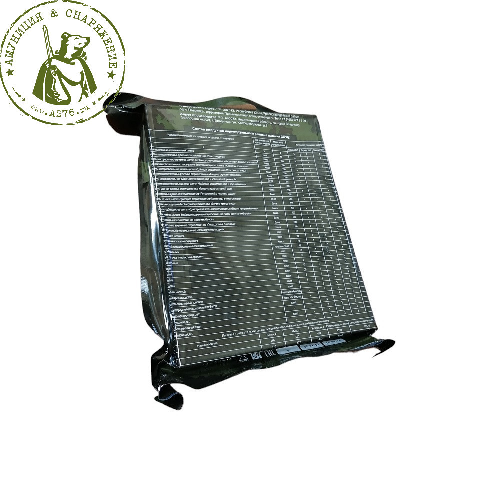 В комплект индивидуального рациона, входит необходимый запас еды и вспомогательных приспособлений для разогрева и подготовки к принятию пищи на 1 сутки