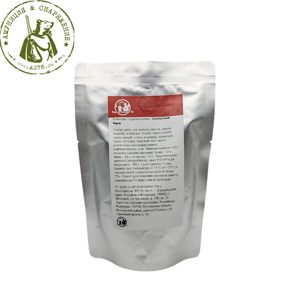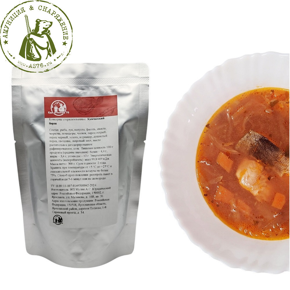 Состав: рыба, лук, капуста, свекла, морковь, помидоры, чеснок, перец острый, перец черный, зелень, кориандр, душистый перец, гвоздика, лавровый лист, масло растительное дезодорированное рафинированное, соль. Пищевая ценность 100 г продукта (средние значения): белки – 4,4 г, жиры – 3,6 г, углеводы – 12 г. Энергетическая ценность (калорийность): ккал 99,8/409 кДж. Масса нетто: 300 г. Срок годности: 2 года. Хранить при температуре от +5 °С до +25°С и относительной влажности воздуха не более 75%. Способ приготовления: разогреть пакет в горячей воде 5-6 минут или на сковороде.