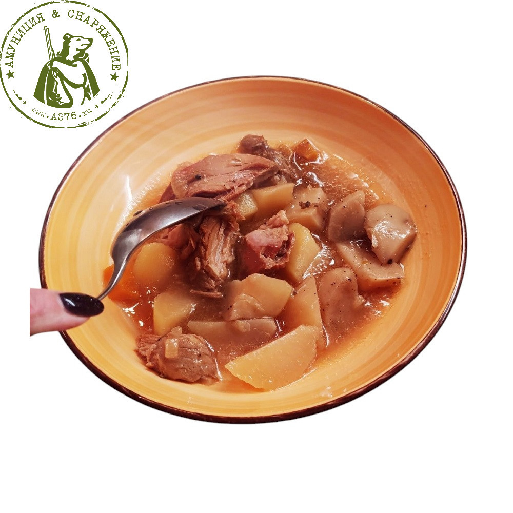 Состав: утка, картофель, черный перец, острый перец, кориандр, горчица, соевый соус, мед, сахар, соль. Пищевая ценность 100 г продукта (средние значения): белки – 8 г, жиры – 17 г, углеводы – 8,7 г. Энергетическая ценность (калорийность): ккал 228,3/936 кДж. Масса нетто: 280 г. Срок годности: 2 года. Хранить при температуре от +5 °С до +25°С и относительной влажности воздуха не более 75%. Способ приготовления: разогреть пакет в горячей воде 5-6 минут или на сковороде. ТУ 10.13.15-008-0169310062-2024.
