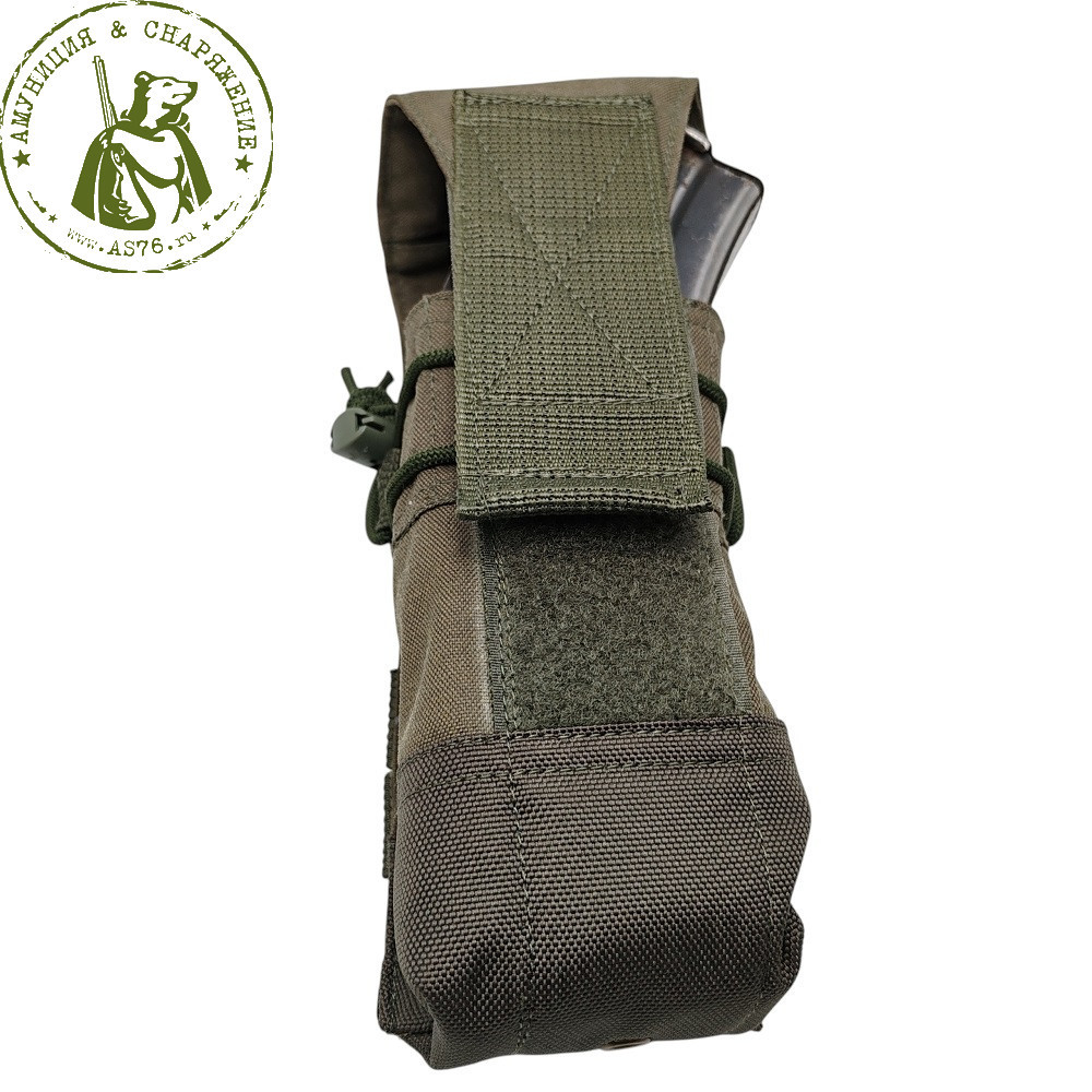 Подсумок крепится на любое снаряжение с интерфейсом MOLLE / PALS / УМТБС: бронежилет, разгрузочную систему, пояс и другие совместимые платформы. Эластичные стропы по бокам дополнительно обжимают магазины и не дают им болтаться или выпадать при активном движении, в том числе при открытом клапане.